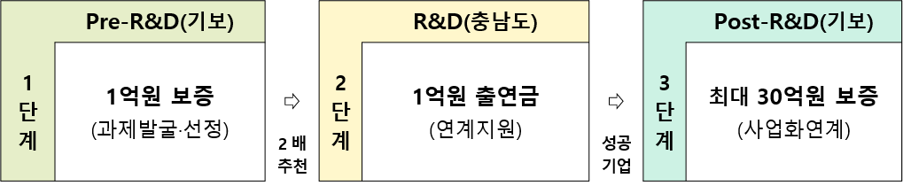 Pre-R&D(개발기획자금 지원 후 추천) → R&D(개발자금 지원) → Post-R&D(사업화자금 지원) 3단계로 구성하고, 과제별로 출연금 차등 지원