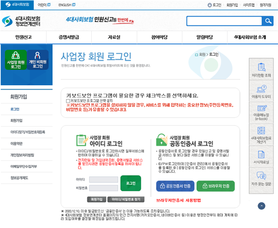 - 법인의 경우 법인 법인 인증서 반드시 회원가입 진행 후 등록, 개인은 바로 등록 후 로그인3. 4대보험정보연계센터