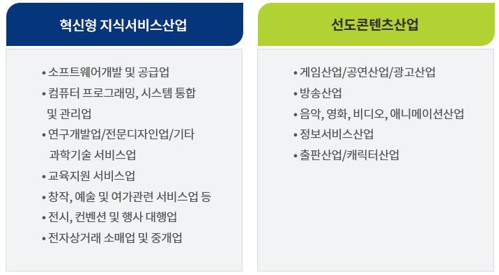 - 혁신형 지식서비스산업과 선도콘텐츠산업 영위기업 중 고부가서비스 용역공급계약을 체결하였거나 체결이 예상되는 기업